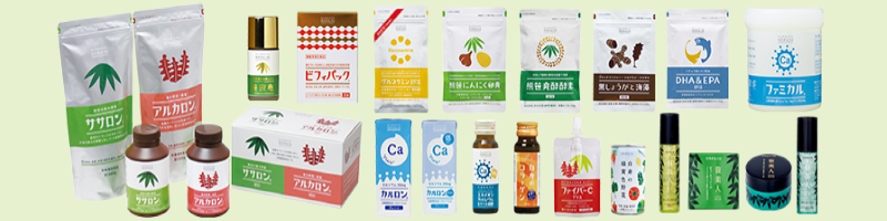 身体を作る上で様々な栄養素が必要となります。 ハクジュは「カルシウム」、「食物繊維」にいち早く着目し、昭和32年に「ササロン(不溶性食物繊維)」を、昭和40年に「アルカロン(水溶性食物繊維)」を、そして、カルシウム飲料「カルロン」を昭和63年に開発しました。